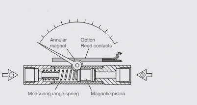 Οι πιέσεις p1 και p2 δρουν στην ⊕ και ⊖ πλευρά του θαλάμου μέτρησης, που χωρίζονται από το φορτισμένο με πίεση μαγνητικό έμβολο ή μαγνητικό έμβολο.